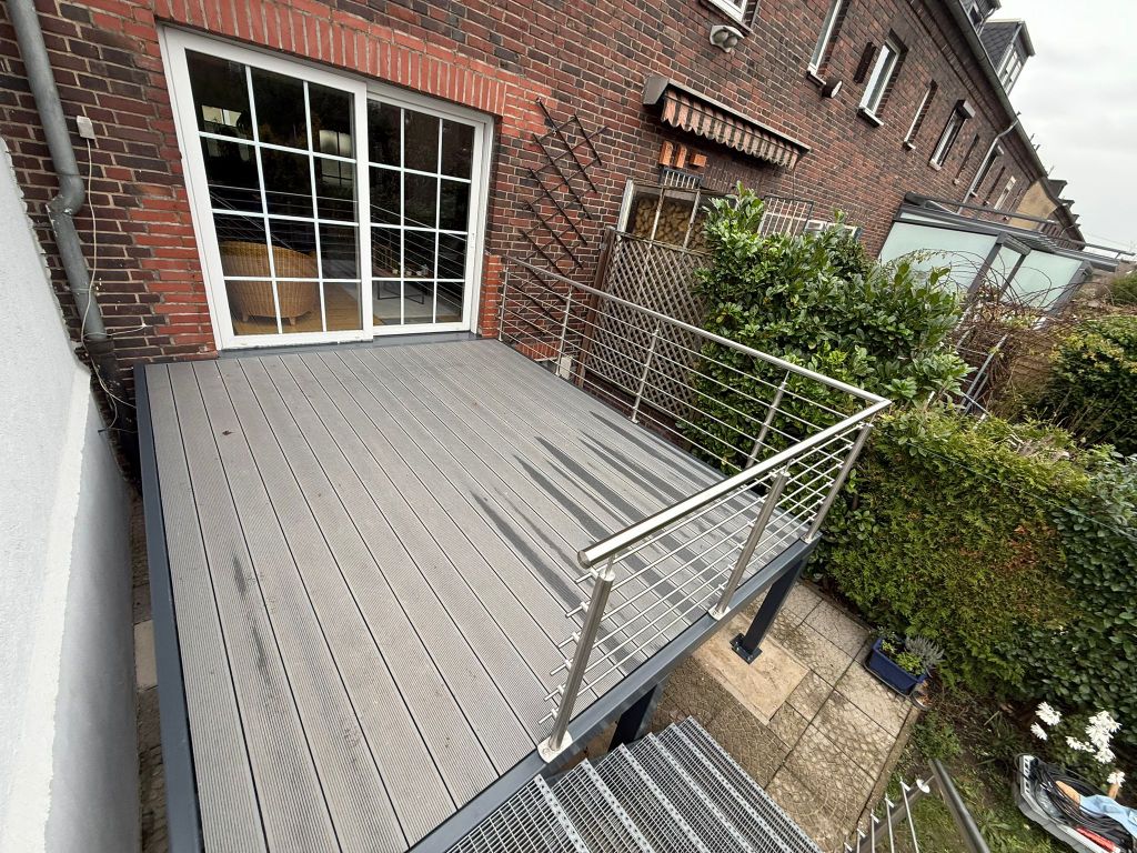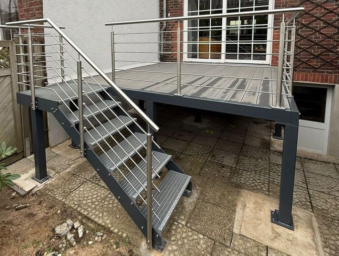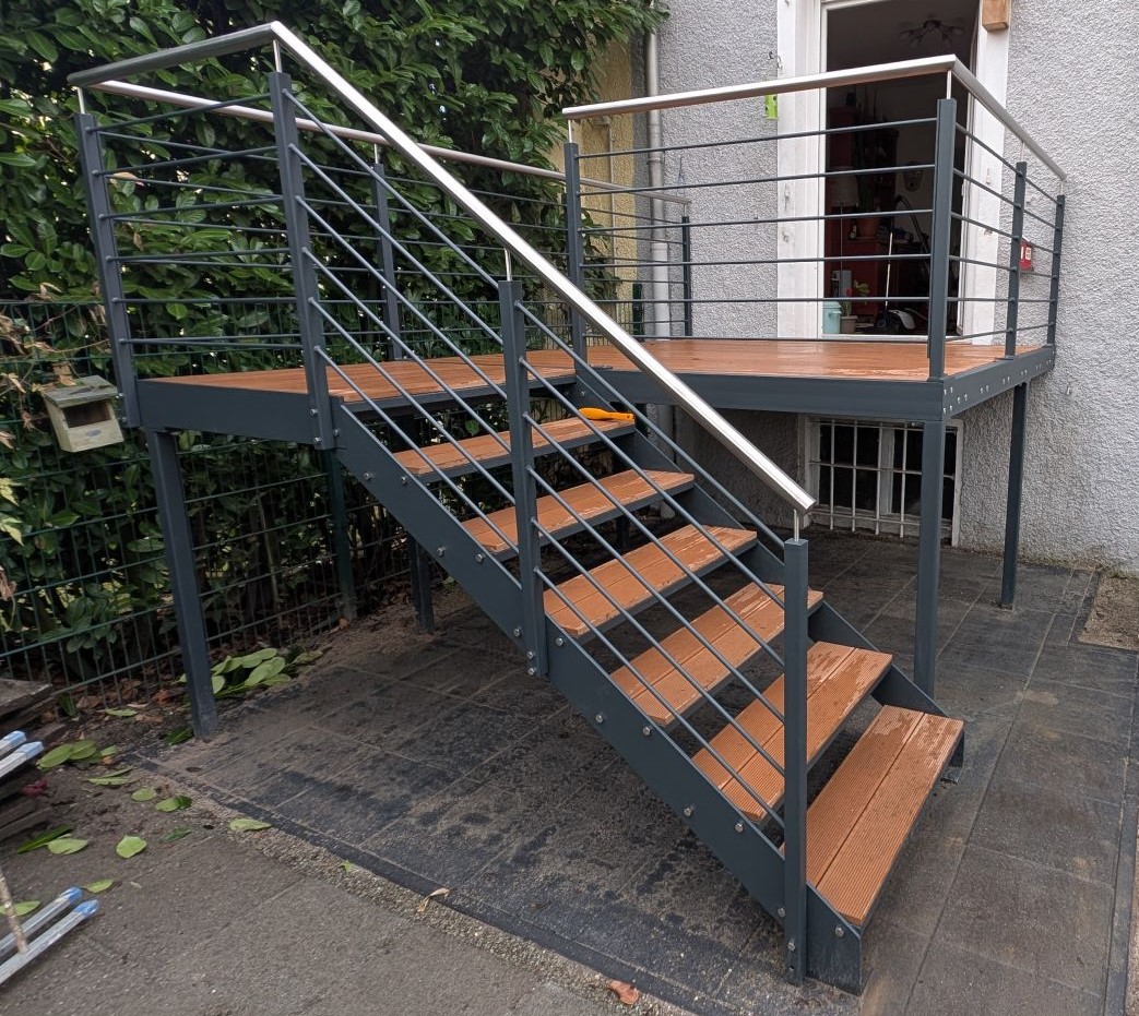 Als Metallbauer kombinieren wir hochwertige Materialien wie Stahl, Edelstahl und WPC-Dielen in Ihrer Wunschfarbe mit moderner Gestaltung, um Ihnen eine Hochterrasse zu bauen, die nicht nur optisch überzeugt, sondern auch funktional und wertbeständig ist.